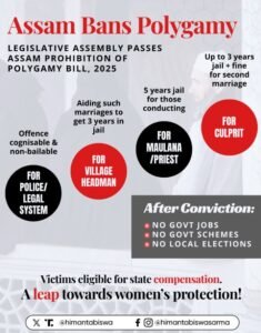 भारत के उत्तर-पूर्वी राज्य Assam की विधान सभा ने  एक ऐतिहासिक फैसला लेते हुए Assam Prohibition of Polygamy Bill, 2025 पारित कर दिया। इस नए कानून का उद्देश्य राज्य में बहुविवाह (एक व्यक्ति द्वारा एक से अधिक वैध विवाह करना) को प्रतिबंधित करना है। इसके तहत पहली पत्नी के जीवन में दूसरी या आगे की शादी करने को दंडनीय अपराध माना जाएगा।यदि कोई व्यक्ति पहली शादी के दौरान दूसरी शादी करता है  यानी पहली पत्नी जीवित है और वैवाहिक बंधन कानूनी रूप से समाप्त नहीं हुआ है  तो उस व्यक्ति को सात साल तक imprisonment की सज़ा हो सकती है। यदि पहली शादी को छिपाकर दूसरी शादी की जाती है  अर्थात जान-बूझकर पहले विवाह को छुपाकर विवाह सम्पन्न किया जाए  तो सज़ा और भी कड़ी होगीइस धर्मनिरपेक्ष कानून के तहत, हिंदू, मुस्लिम, ईसाई और अन्य धर्मों के लिए समान रूप से बहुविवाह निषिद्ध होगा।