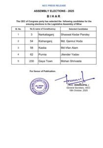 बिहार विधानसभा चुनाव 2025: कांग्रेस ने जारी की दूसरी उम्मीदवार सूची, पांच सीटों पर घोषित किए नाम