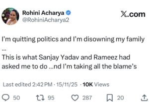 रोहिणी का यह कदम पार्टी की अंदरूनी लड़ाई को सार्वजनिक रूप से उजागर करता है। पिछले कुछ वर्षों में रोहिणी पार्टी की सोशल मीडिया टीम की प्रमुख आवाज रही हैं। 2022 में उन्होंने अपने पिता लालू प्रसाद यादव को किडनी दान किया था, जिसके बाद से वे लगातार चर्चा में रहीं।लेकिन बिहार विधानसभा चुनाव 2025 में मिली करारी हार के बाद उनका राजनीति और परिवार से दूरी बनाना इस बात का संकेत माना जा रहा है कि राजद की अंदरूनी लड़ाई अब सतह पर आ गई है।