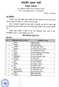 BJP ने मंगलवार को विधानसभा चुनाव के लिए अपनी पहली सूची जारी कर दी।लिस्ट में 71 उम्मीदवारों के नाम हैं, जिनमें 9 महिलाएं शामिल हैं।दोनों डिप्टी सीएम—सम्राट चौधरी को तारापुर से और विजय सिन्हा को लखीसराय से टिकट दिया गया है।