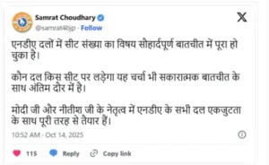 पोस्ट में लिखा गया, एनडीए दलों में सीट संख्या का विषय सौहार्दपूर्ण बातचीत में पूरा हो चुका है। कौन दल किस सीट पर लड़ेगा, यह चर्चा भी सकारात्मक बातचीत के साथ अंतिम दौर में है।