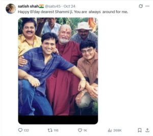 सतीश शाह का एक्स (पूर्व ट्विटर) पर आखिरी पोस्ट भी सोशल मीडिया पर वायरल हो रहा है। इस पोस्ट में उन्होंने बॉलीवुड के दिग्गज अभिनेता शम्मी कपूर को ट्रिब्यूट दिया था।