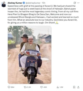 असरानी ने अपने सोशल मीडिया अकाउंट के माध्यम से दिवाली की शुभकामनाएं दीं, और कुछ ही घंटों बाद उनका निधन हो गया। उनकी यह अंतिम पोस्ट उनके फैंस के लिए भावनात्मक पल बन गई।