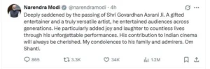 असरानी के निधन पर दुख जताते हुए प्रधानमंत्री नरेंद्र मोदी ने अपने आधिकारिक सोशल मीडिया अकाउंट से लिखा है-