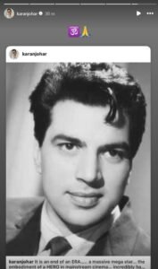करण जौहर ने सोशल मीडिया पर भावुक पोस्ट में कहा-“एक युग का अंत” करण जौहर ने इंस्टाग्राम पर लिखा “यह एक ERA का अंत है। धर्मेंद्र जी जैसे मेगा-स्टार और अच्छे इंसान अब शायद ही कभी हों। उनका आशीर्वाद, उनका प्यार, उनका गले लगाना… सब याद आएगा। इंडस्ट्री में आज एक ऐसी जगह खाली हो गई है जिसे कोई नहीं भर सकता। हम आपसे प्यार करते हैं सर। OM SHANTI।”