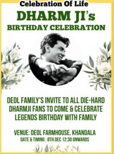 मीडिया रिपोर्टस के अनुसार, देओल परिवार फार्महाउस पर भी जन्मदिन की स्मृति कार्यक्रम आयोजित कर रहा है।जिसका समय दोपहर 12.30 बजे होगा।परिवार का कहना है कि यह उनके पिता की विरासत और व्यक्तित्व का सम्मान करने का तरीका है।