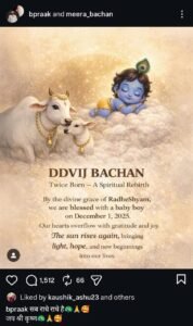बी प्राक और मीरा बच्चन ने अपने बेटे का नाम ‘द्विज बच्चन’ रखा है। सिंगर ने बताया कि इस नाम का अर्थ है “दो बार जन्म लेने वाला”, यानी आध्यात्मिक पुनर्जन्म। नाम के अर्थ ने फैंस का दिल जीत लिया है और सोशल मीडिया पर इसकी जमकर तारीफ हो रही है।हालांकि कपल ने बेटे की तस्वीर साझा नहीं की, लेकिन बी प्राक ने भगवान श्रीकृष्ण, गौ माता और बछड़े की एक सुंदर तस्वीर पोस्ट की। इसके साथ उन्होंने कैप्शन में लिखा कि “सब राधे-राधे है। जय श्री कृष्ण।”