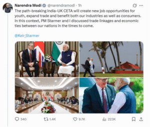 PM मोदी ने कहा, “प्रधानमंत्री स्टार्मर के नेतृत्व में भारत और ब्रिटेन के संबंधों में उल्लेखनीय प्रगति हुई है। इस साल जुलाई में, मेरी ब्रिटेन यात्रा के दौरान, हमने ऐतिहासिक व्यापक आर्थिक और व्यापार समझौते (CETA) पर हस्ताक्षर किए थे।” ब्रिटेन के प्रधानमंत्री कीर स्टार्मर के साथ एक संयुक्त बयान में, प्रधानमंत्री मोदी ने कहा, “भारत और ब्रिटेन के बीच कल व्यावसायिक नेताओं का सबसे बड़ा शिखर सम्मेलन हुआ। आज, हम इंडिया-यूके CEO फोरम और ग्लोबल फिनटेक फेस्टिवल को संबोधित करेंगे। इन सब से भारत-यूके सहयोग को और मजबूत करने के सुझाव और संभावनाएं सामने आएंगी।”