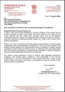 भारतीय कम्युनिस्ट पार्टी (सीपीआई) के राज्यसभा सांसद पी. संदोष कुमार ने मुख्य चुनाव आयुक्त को पत्र लिखकर शिकायत की है। उनका आरोप है कि प्रधानमंत्री का यह संबोधन पूरी तरह राजनीतिक था और इसमें आदर्श आचार संहिता का उल्लंघन हुआ है। शिकायत में यह भी कहा गया है कि राष्ट्र के नाम संबोधन का उपयोग राजनीतिक हमलों और विपक्षी दलों की आलोचना के लिए किया गया, जो नियमों के खिलाफ है।