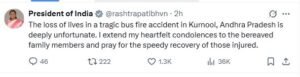 राष्ट्रपति द्रौपदी मुर्मू ने अपने एक्स पर लिखा कि “आंध्र प्रदेश के कुरनूल में बस में आग लगने की दुखद घटना में हुई जान-माल की हानि अत्यंत दुर्भाग्यपूर्ण है। मैं शोक संतप्त परिजनों के प्रति हार्दिक संवेदना व्यक्त करती हूं और घायलों के शीघ्र स्वस्थ होने की प्रार्थना करती हूं।”