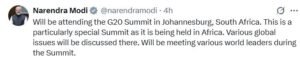 रवाना होने से पहले प्रधानमंत्री मोदी ने कहा कि यह यात्रा दक्षिण अफ्रीकी राष्ट्रपति सिरिल रामाफोसा के औपचारिक निमंत्रण पर हो रही है। उन्होंने कहा, “मैं जोहान्सबर्ग में होने वाले 20वें G20 शिखर सम्मेलन में भारत का दृष्टिकोण प्रस्तुत करूंगा, जो हमारे ‘वसुधैव कुटुम्बकम’ और ‘एक पृथ्वी, एक परिवार, एक भविष्य’ के आदर्शों के अनुरूप है। यह शिखर सम्मेलन वैश्विक मुद्दों पर महत्वपूर्ण चर्चा का अवसर है।”