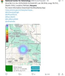 हरियाणा के रोहतक और झज्जर जिले में रविवार दोपहर हल्के भूकंप के झटके महसूस किए गए, जिससे कुछ देर के लिए लोगों में दहशत का माहौल बन गया। राष्ट्रीय भूकंप विज्ञान केंद्र (NCS) के अनुसार, भूकंप दोपहर 12 बजकर 13 मिनट 44 सेकंड पर आया और इसकी तीव्रता रिक्टर स्केल पर 3.3 मापी गई।NCS के मुताबिक, भूकंप का केंद्र रोहतक से लगभग 17 किलोमीटर दक्षिण-पूर्व, सांपला और इस्माईला गांव के बीच स्थित था। भूकंप की गहराई धरती के भीतर करीब 5 किलोमीटर दर्ज की गई, जबकि कुछ रिपोर्ट्स में इसकी गहराई लगभग 10 किलोमीटर बताई गई है। कम गहराई के कारण झटके आसपास के इलाकों में भी महसूस किए गए।