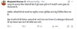 राजस्थान की राजधानी जयपुर में सोमवार को दिल दहला देने वाला मामले सामने आया है। जयपुर में हुए सड़क दुर्घटना ने पूरे शहर को हिला कर रख दिया। हरमाड़ा थाना क्षेत्र के लोहामंडी रोड पर एक बेकाबू डंपर ट्रक ने पहले एक कार को जोरदार टक्कर मारी और फिर रफ्तार के कहर में बिना रुके 4 अन्य वाहनों को रौंदता चला गया।इस भीषण हादसे में कम से कम 10 लोगों की मौके पर ही मौत हो गई, जबकि 50 से अधिक लोग गंभीर रूप से घायल बताए जा रहे हैं। घायलों को नजदीकी अस्पतालों में भर्ती कराया गया है, जिनमें से कई की हालत नाजुक बनी हुई है। हादसे के बाद पूरे इलाके में चीख-पुकार और भगदड़ मच गई।