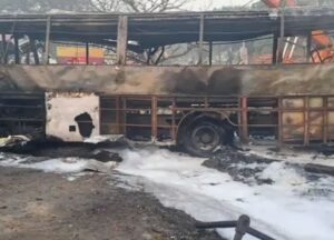 उत्तर प्रदेश के बलरामपुर जिले में सोमवार देर रात फुलवरिया बाईपास पर एक निजी बस और ट्रक की जोरदार टक्कर के बाद भीषण आग लग गई। हादसे में 3 लोगों की जलकर दर्दनाक मौत हो गई, जबकि 24 यात्री गंभीर रूप से झुलस गए, जिनमें से 6 की हालत नाजुक बताई जा रही है। हादसे के बाद मौके पर चीख-पुकार मच गई और बचाव टीमों ने तुरंत राहत कार्य शुरू किया।प्रत्यक्षदर्शियों और पुलिस के अनुसार, यह दर्दनाक घटना रात करीब 2:30 बजे हुई।सुनौली बॉर्डर से दिल्ली जा रही बस UP 22 AT 0245, फुलवरिया चौराहे से गोंडा की ओर बढ़ रही थी। इसी दौरान फुलवरिया ओवरब्रिज की ओर से आ रहा तेज रफ्तार ट्रक UP 21 DT 5237 बस से सीधे भिड़ गया। टक्कर इतनी जोरदार थी कि बस सड़क पर लगभग 100 मीटर तक घिसटती चली गई, सड़क किनारे लगे हाईटेंशन लाइन के खंभे से जाकर टकरा गई,खंभा टूटकर बस पर गिर गया, और बस में करंट फैलने से शॉर्ट सर्किट हुआ और आग लग गई।कुछ ही सेकंड में पूरी बस आग का गोला बन गई और यात्री अंदर ही फंस गए।