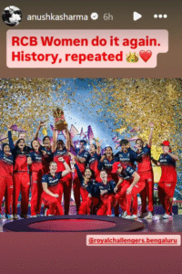 इस जीत के बाद अनुष्का शर्मा ने सोशल मीडिया पर अपनी प्रतिक्रिया दी। उन्होंने इंस्टाग्राम स्टोरी पर आरसीबी महिला टीम की ट्रॉफी उठाते हुए एक तस्वीर साझा की और लिखा, आरसीबी महिला टीम ने फिर कमाल कर दिखाया। इतिहास दोहराया गया।” अनुष्का की इस पोस्ट को फैन्स खूब पसंद कर रहे हैं।