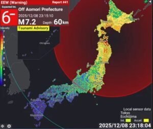 जापान के उत्तर-पूर्वी तट पर देर रात 7.6 तीव्रता का शक्तिशाली भूकंप आया, जिससे व्यापक दहशत फैल गई। शुरुआत में कई तटीय इलाकों के लिए सुनामी की चेतावनी जारी की गई थी, जिसे बाद में खतरा टलने पर हटा दिया गया।जापान मौसम विज्ञान एजेंसी (JMA) के अनुसार, भूकंप आओमोरी और होक्काइडो के बीच समुद्री क्षेत्र में आया और इसका केंद्र समुद्र तल से लगभग 50–53 किलोमीटर गहराई पर था।