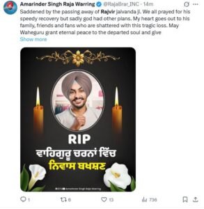 कांग्रेस अध्यक्ष अमरिंदरसिंह राजा ने सिंगर राजवीर जवंदा को एक्स पर श्रद्धांजलि 11 दिन से थे फोर्टिस अस्पताल में भर्ती