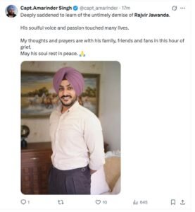 राजवीर की मौत की खबर सुनते ही उनके चाहने वालों का दिल टूट गया।पंजाब के नेताओं व पंजाबी जगत के सितारे राजवीर जवंदा की मौत से स्तब्ध हैं। पंजाब के पूर्व मुख्यमंत्री कैप्टन अमरिन्द्र सिंह ने एक्स पर पोस्ट कर उन्हे श्रद्धांजलि दी है।राज्यसभा सांसद राघव चड्डा ने भी एक्स पर पोस्ट कर उन्हे श्रद्धांजलि दी है।