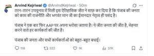 AAP के पंजाब प्रभारी मनीष सिसोदिया ने इस जीत को बड़ी उपलब्धि बताया। उन्होंने कहा, “इस उपचुनाव में पंजाब की जनता ने अकाली दल, कांग्रेस और भाजपा को नकार दिया है। कांग्रेस नेताओं द्वारा दलितों का अपमान और उनके असंगत बयानबाजी ने जनता को नाराज किया। जनता ने साफ कर दिया कि वह ईमानदार नेतृत्व और काम की राजनीति को ही पसंद करती है।”AAP के राष्ट्रीय अध्यक्ष और पंजाब के मुख्यमंत्री अरविंद केजरीवाल ने कहा, “तरनतारन उपचुनाव में मिली इस ऐतिहासिक जीत ने साबित कर दिया है कि पंजाब की जनता काम की राजनीति और भगवंत मान के ईमानदार नेतृत्व पर भरोसा करती है। यह जीत जनता की, मेहनत करने वाले हर कार्यकर्ता की और हमारी पूरी टीम की है।”