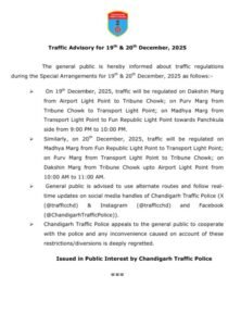 शुक्रवार, 19 दिसंबर रात 9 बजे से 10 बजे तक एयरपोर्ट लाइट पॉइंट से न्यू लेबर चौक (सेक्टर 20/21–33/34) तक दक्षिण मार्ग पर ट्रैफिक नियंत्रित रहेगा।न्यू लेबर चौक से हीरा सिंह चौक (सेक्टर 5/6–33/34) की ओर सरोवर पथ, सेक्टर 7/8 चौक तक यातायात रेगुलेट किया जाएगा।लोक भवन, पंजाब के आसपास भी ट्रैफिक नियंत्रण लागू रहेगा।शनिवार, 20 दिसंबर को भी सुबह 10 बजे से 11 बजे तक लोक भवन, पंजाब से हीरा सिंह चौक तक ट्रैफिक रेगुलेट किया गया है।सेक्टर 7/8 चौक पर यातायात नियंत्रण किया जाएगा।हीरा सिंह चौक से न्यू लेबर चौक तक सरोवर पथ पर रेगुलेशन और न्यू लेबर चौक से एयरपोर्ट लाइट पॉइंट तक दक्षिण मार्ग पर ट्रैफिक नियंत्रित रहेगा।