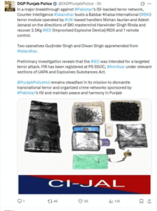 जांच में यह तथ्य भी सामने आया है कि जालंधर से पकड़ा गया मॉड्यूल पाकिस्तान स्थित ISI और यूके-आधारित हैंडलरों द्वारा निर्देशित था। इस नेटवर्क को बब्बर खालसा इंटरनेशनल (BKI) का समर्थन प्राप्त था। पुलिस ने बताया कि इस नेटवर्क का संचालन BKI के मास्टरमाइंड हरविंदर सिंह रिंदा के आदेशों के तहत किया जा रहा था। यूके से नेटवर्क को नियंत्रित किया जा रहा था और स्थानीय स्तर पर पंजाब में आतंक फैलाने की योजना बनाई जा रही थी।