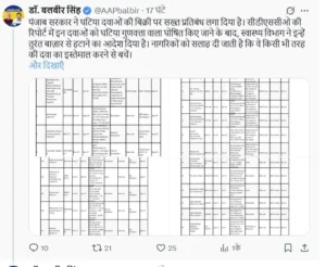 केंद्रीय औषधि मानक नियंत्रण संगठन (CDSCO) ने कुछ दिन पहले देशभर में घटिया दवाओं की पहचान करते हुए चेतावनी जारी की थी। इसी के बाद पंजाब सरकार ने राज्य में इन सभी दवाओं की बिक्री, वितरण और उपयोग पर तत्काल प्रभाव से रोक लगा दी है।स्वास्थ्य मंत्री डॉ. बलबीर सिंह ने सोशल मीडिया पोस्ट में कहा—“कृपया ऊपर दी गई किसी भी दवा का उपयोग न करें। अगर इनमें से कोई भी दवा किसी दुकान पर बेची जा रही है, तो तुरंत स्वास्थ्य विभाग को सूचित करें। पंजाब सरकार नागरिकों के स्वास्थ्य और सुरक्षा को सर्वोच्च प्राथमिकता देती है।”