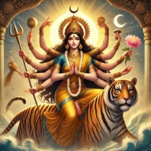 नवरात्रि का तीसरा दिन देवी दुर्गा के तीसरे स्वरूप मां चंद्रघंटा को समर्पित होता है। मां चंद्रघंटा सौंदर्य, शांति और वीरता की देवी हैं। उनका स्वरूप अत्यंत प्रभावशाली और मन को मोह लेने वाला होता है। मां के मस्तक पर अर्धचंद्र से सजी हुई घंटे के आकार की आकृति होती है, जिस कारण इनका नाम “चंद्रघंटा” पड़ा। इनका शरीर स्वर्ण के समान चमकदार है, दस भुजाएं हैं और सिंह इनका वाहन है। उनके हाथों में विभिन्न अस्त्र-शस्त्र होते हैं जो इस बात का प्रतीक हैं कि वे हर संकट और बुराई का सामना करने में सक्षम हैं।