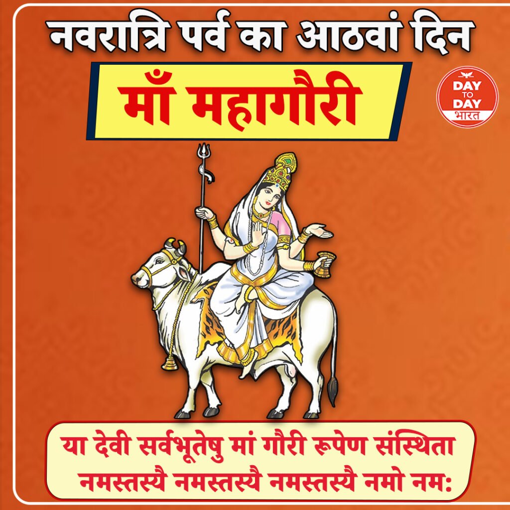 नवरात्र के आठवें दिन देवी भगवती के आठवें स्वरूप मां महागौरी की पूजा की जाती है। शास्त्रों में उनकी उपमा शंख, चंद्र और कुंद के फूल से दी गई है। मां महागौरी सौभाग्य और मानसिक शुद्धता की देवी मानी जाती हैं।