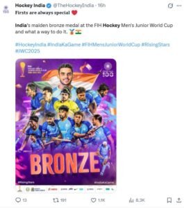 ब्रॉन्ज मेडल मैच के बाद IND vs ARG गूगल पर तेजी से ट्रेंड करने लगा।लाखों भारतीयों ने मैच के हाइलाइट्स और स्कोर गूगल पर सर्च किए।तीन क्वार्टर तक संघर्ष, फिर 11 मिनट में चार गोल टीम इंडिया ने दिखा दिया कि जज्बा और हिम्मत हो तो कोई भी मुकाबला जीता जा सकता है।यह ब्रॉन्ज मेडल सिर्फ जीत नहीं, बल्कि भारतीय हॉकी के भविष्य की मजबूती का संकेत है।