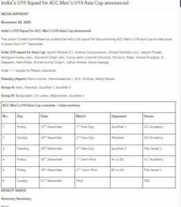 भारतीय क्रिकेट कंट्रोल बोर्ड (BCCI) ने पुरुष अंडर-19 एशिया कप 2025 के लिए टीम इंडिया की घोषणा कर दी है। यह प्रतिष्ठित टूर्नामेंट 12 से 21 दिसंबर के बीच दुबई में आयोजित किया जाएगा। 15 सदस्यीय भारतीय टीम की कप्तानी 18 वर्षीय मुंबई के युवा बल्लेबाज़ आयुष म्हात्रे को सौंपी गई है, जबकि विहान मल्होत्रा उपकप्तान की भूमिका निभाएंगे।इस बार टूर्नामेंट विशेष रूप से चर्चा में है क्योंकि भारत और पाकिस्तान को एक ही ग्रुप (ग्रुप-A) में रखा गया है, और दोनों टीमें 14 दिसंबर को हाई-वोल्टेज मुकाबले में आमने-सामने होंगी।