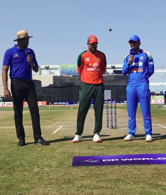 भारत को आखिरी गेंद पर 4 रन चाहिए थे।हर्ष दुबे ने शॉट लगाया और रन लेने दौड़े।इस दौरान बांग्लादेश के कप्तान और विकेटकीपर अकबर अली ने रन आउट करने के लिए गेंद स्टंप्स की ओर फेंकी, लेकिन गेंद स्टंप्स को मिस करती हुई ऑफ साइड की ओर निकल गई।इस मौके का फायदा उठाते हुए हर्ष दुबे और नेहल वढेरा ने 3 रन चुरा लिए।भारत का स्कोर 194 हो गया और मैच टाई हो गया।