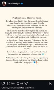 विनेश ने अपने बयान में लिखा कि “लोग पूछते रहे कि क्या पेरिस अंत था। लंबे समय तक मेरे पास इसका जवाब नहीं था। मुझे मैट, उम्मीदों और दबाव से दूर रहने की ज़रूरत थी। सालों में पहली बार मैंने खुद को breathing space दी। इस दौरान मुझे एहसास हुआ कि मैं अभी भी इस खेल से प्यार करती हूं, मैं अब भी लड़ना चाहती हूं।”उन्होंने आगे लिखा कि“इस चुप्पी में मुझे वो मिला जिसे मैं भूल गई थी आग कभी खत्म नहीं हुई थी। वो बस थकान और शोर के बीच दब गई थी। मैं चाहे जितनी दूर चली गई, लेकिन मेरा एक हिस्सा हमेशा मैट पर ही था।”