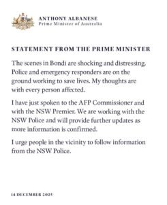 प्रधानमंत्री एंथनी अल्बनीज ने घटना को “बेहद चौंकाने वाला और दिल दहला देने वाला” बताया। उन्होंने कहा कि पुलिस और आपातकालीन सेवाएं लगातार लोगों की जान बचाने में जुटी हैं।