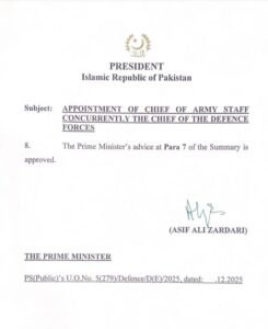 पाकिस्तान में एक ऐतिहासिक और रणनीतिक बदलाव करते हुए फील्ड मार्शल असीम मुनीर को देश का पहला चीफ ऑफ डिफेंस फोर्सेज (CDF) नियुक्त कर दिया गया है। राष्ट्रपति आसिफ अली जरदारी ने प्रधानमंत्री शहबाज शरीफ की सिफारिश पर इस निर्णय पर मुहर लगाई।हाल ही में पास हुए 27वें संविधान संशोधन के तहत बनाया गया CDF का पद अब देश की तीनों सेनाओं थल सेना, नौसेना और वायुसेना का सर्वोच्च कमांडर होगा। इस पद के गठन के साथ ही ज्वाइंट चीफ्स ऑफ स्टाफ कमेटी (CJCSC) को समाप्त कर दिया गया है।