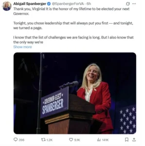 एबिगेल स्पैनबर्गर पूर्व कांग्रेसी और CIA ऑफिसर रही हैं। उन्होंने अपने चुनाव अभियान में आर्थिक विकास, शिक्षा सुधार और सार्वजनिक सुरक्षा को प्रमुख मुद्दा बनाया। स्पैनबर्गर ने राज्य के स्विंग वोटर्स को आकर्षित करते हुए, फेडरल सरकारी कर्मचारियों और पेंटागन कर्मियों की चिंताओं पर भी जोर दिया, जो राष्ट्रपति ट्रंप की कटौतियों से प्रभावित हुए थे।राज्य की राजनीतिक परिदृश्य पर नजर डालें तो वर्जीनिया की गवर्नर सीट आमतौर पर डेमोक्रेट्स और रिपब्लिकन्स के बीच झूलती रही है। इसलिए इस चुनाव नतीजे को मिडटर्म चुनावों से पहले वोटर्स के मूड का स्पष्ट संकेत माना जा रहा है।स्पैनबर्गर की जीत के साथ ही डेमोक्रेट्स ने न्यू जर्सी में भी गवर्नर पद और न्यूयॉर्क शहर में मेयर पद जीत हासिल की है।
