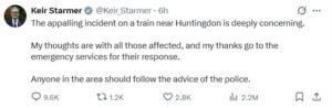 ब्रिटिश प्रधानमंत्री कीर स्टार्मर ने इस भयावह हमले की कड़ी निंदा की और पीड़ितों के प्रति संवेदना जताई। उन्होंने सोशल मीडिया पर लिखा,“हंटिंगडन के पास ट्रेन में हुई यह भयावह घटना बेहद चिंताजनक है। मेरी संवेदनाएं सभी प्रभावित लोगों के साथ हैं। आपातकालीन सेवाओं को उनकी त्वरित प्रतिक्रिया के लिए धन्यवाद। इलाके में मौजूद लोग पुलिस की सलाह का पालन करें।”इस घटना के बाद हंटिंगडन क्षेत्र की ओर जाने वाली सड़कों और लंदन एंड नॉर्थ ईस्टर्न रेलवे (LNER) की सेवाओं में भारी बाधा आई। ट्रेन यात्रियों को देर रात लंदन जाने के लिए बसों में स्थानांतरित किया गया।हमले के बाद लंदन और कैंब्रिजशायर के कई रेलवे स्टेशनों पर सुरक्षा कड़ी कर दी गई है। यात्रियों से सहयोग करने और सतर्क रहने की अपील की गई है।
