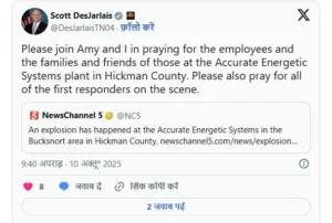 टेनेसी के सांसद स्कॉट डेसजार्लिस मौके पर पहुंचे और लापता कर्मचारियों के परिजनों से मुलाकात की। उन्होंने सोशल मीडिया प्लेटफॉर्म X (पूर्व ट्विटर) पर लिखा – “कृपया Accurate Energetic Systems प्लांट के कर्मचारियों, उनके परिवारों और रेस्क्यू टीमों के लिए प्रार्थना करें। यह हमारे समुदाय के लिए बहुत बड़ा नुकसान है।”